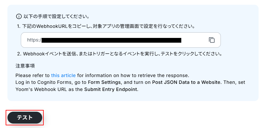 ここまで準備できたらYoomの画面に戻り、テスト をクリックしましょう。