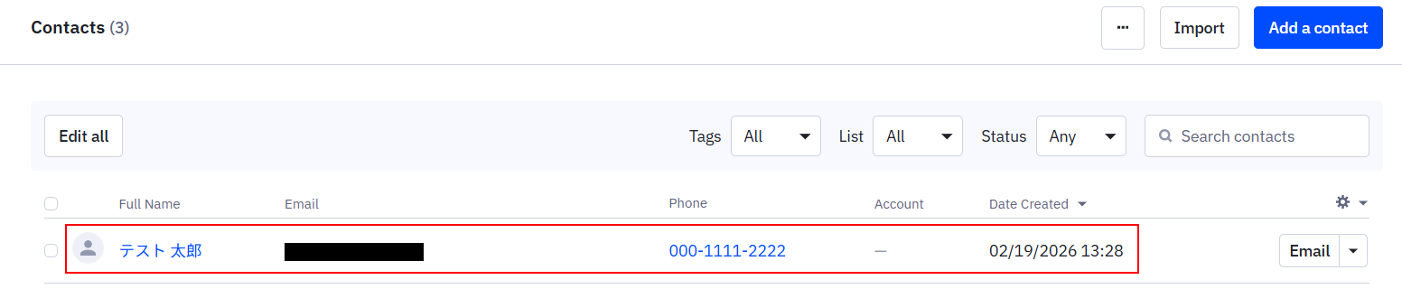 テストをクリックすると実際にコンタクトが作成されます。