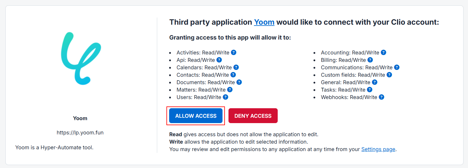 表示内容を確認し、問題なければALLOW ACCESSをクリックします。