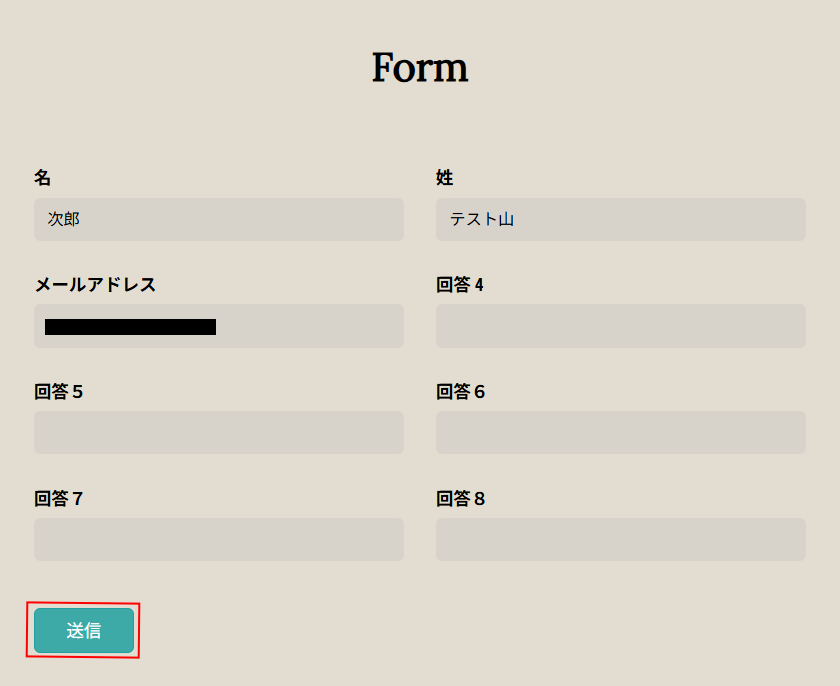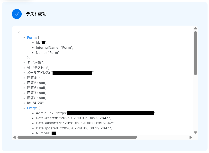 ここまで設定できたら、先ほどWebhookURLを登録したフォームから実際にテスト用データを送信しましょう。