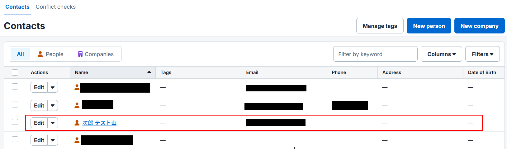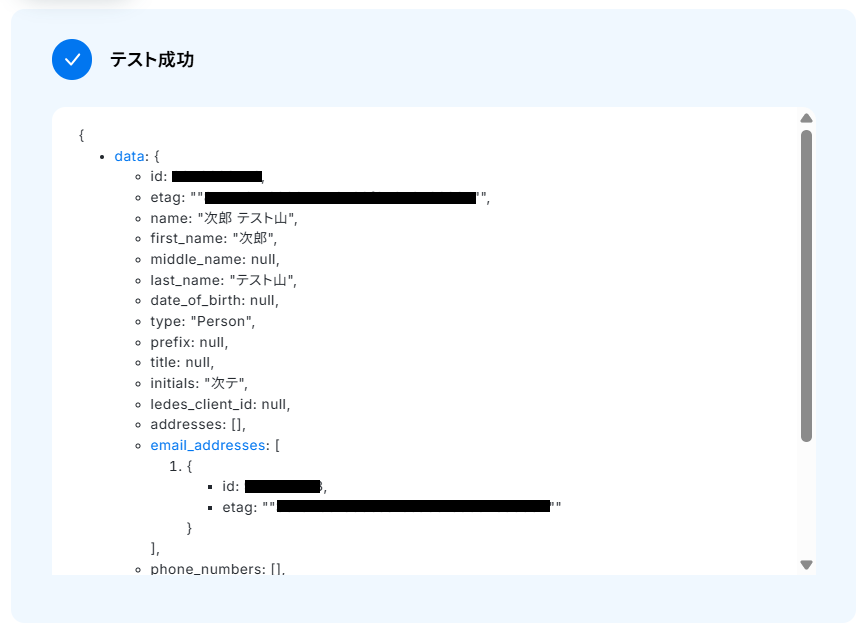 テストをクリックすると、実際にPerson Contactが作成されます。