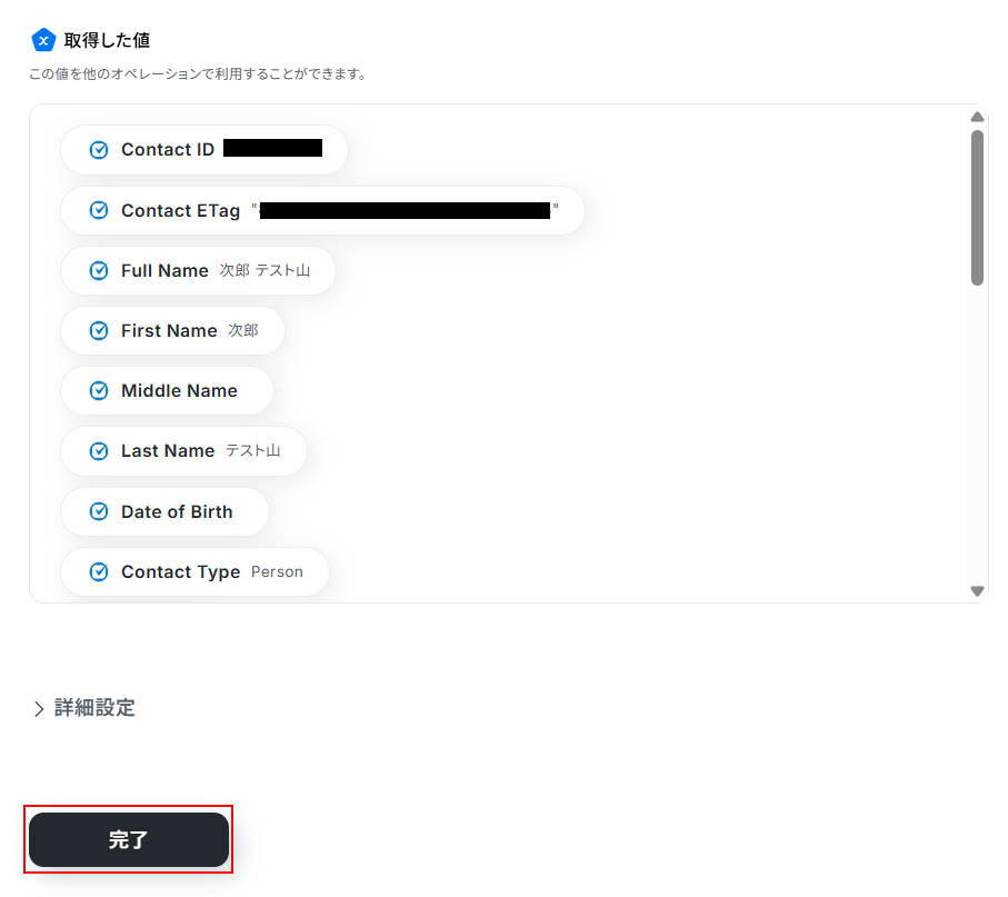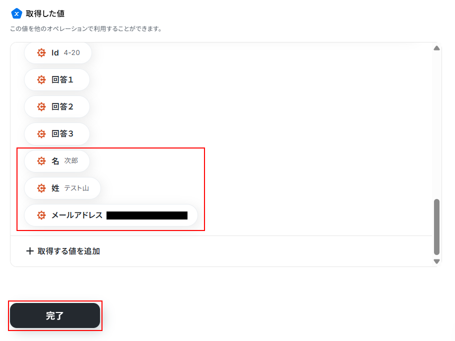 取得した値の項目内に追加した値が表示されているのを確認できたら、忘れずに完了をクリックしましょう。