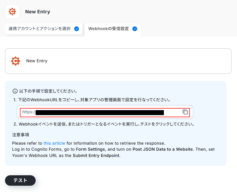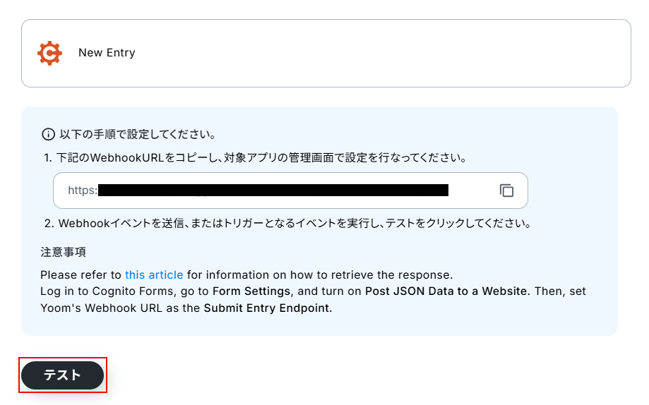 ここまで準備できたらYoomの画面に戻り、テストをクリックしましょう。