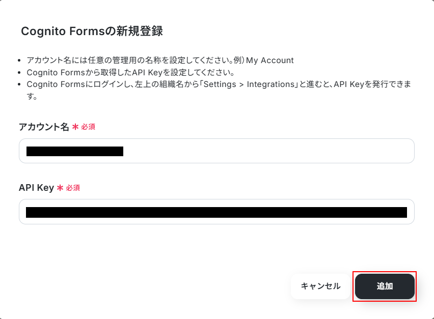 表示内容を確認し、アカウント名、API Keyを入力できたら追加をクリックしましょう。