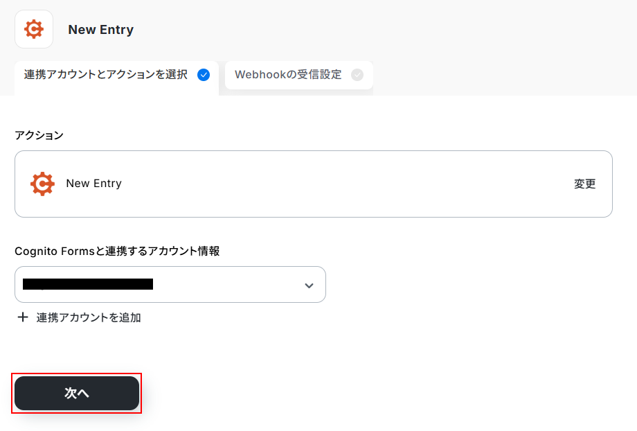 - 次に、トリガーでCognito Formsを選択し、「New Entry」というアクションを設定します。