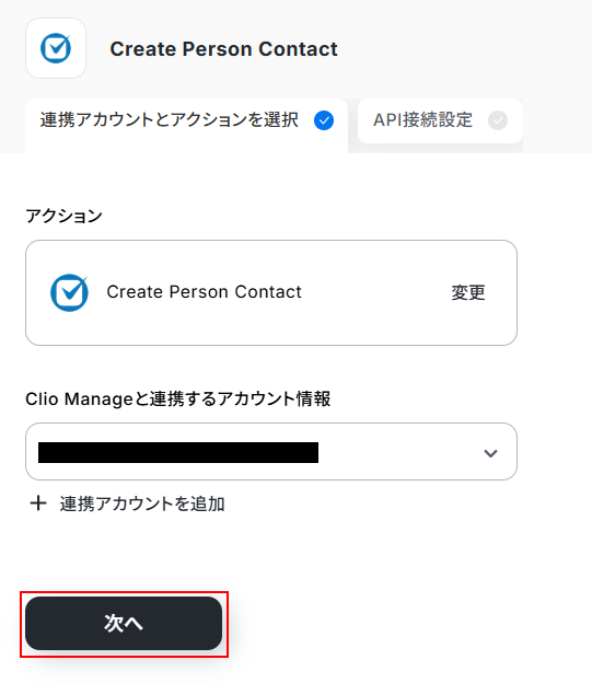 - 最後に、オペレーションでClio Manageを選択し、「Create Person Contact」アクションを設定します。