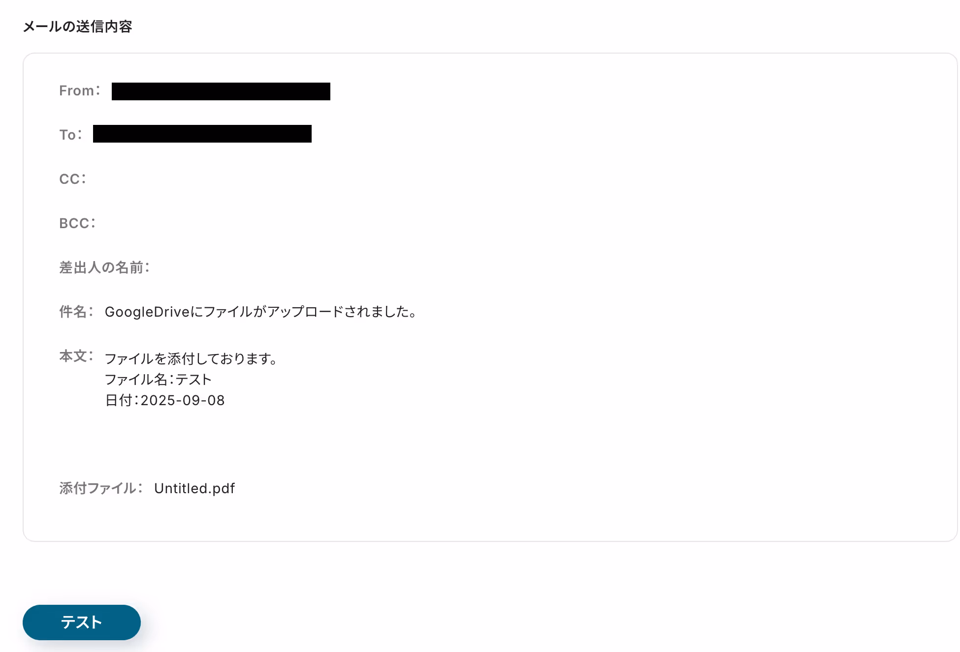 確認後は「テスト」を行い、実際にGmailからメールが送信されることを確認してください。