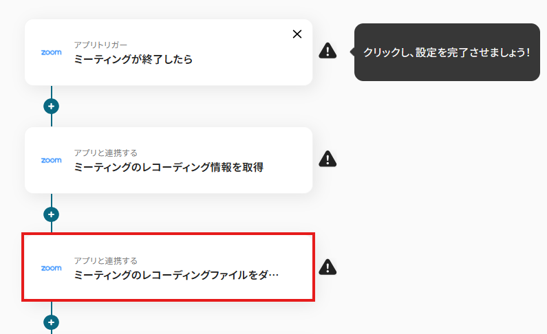 ・現在は「ミーティングが終了したら」「ミーティングのレコーディング情報を取得する」というアクションがZoomの有料プランのみの対応となっています。