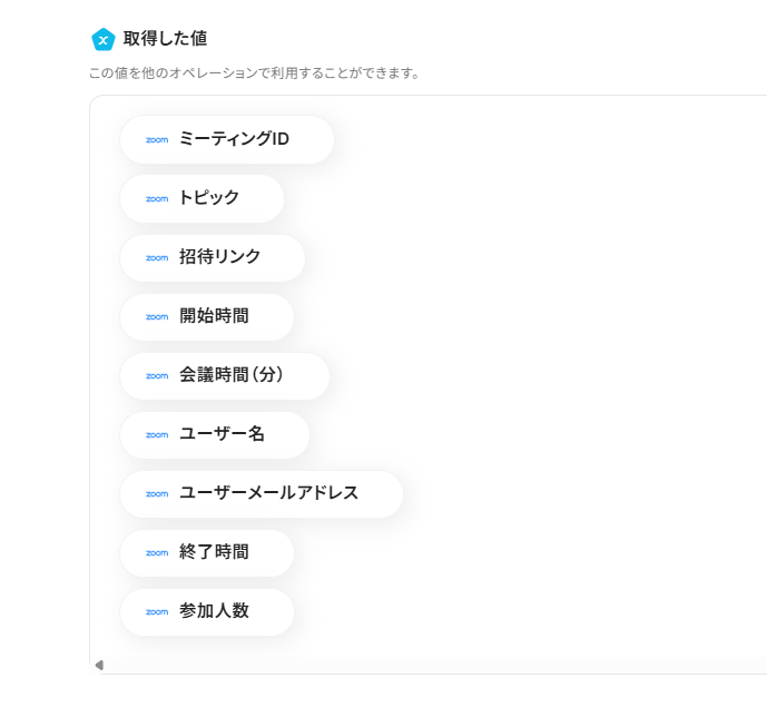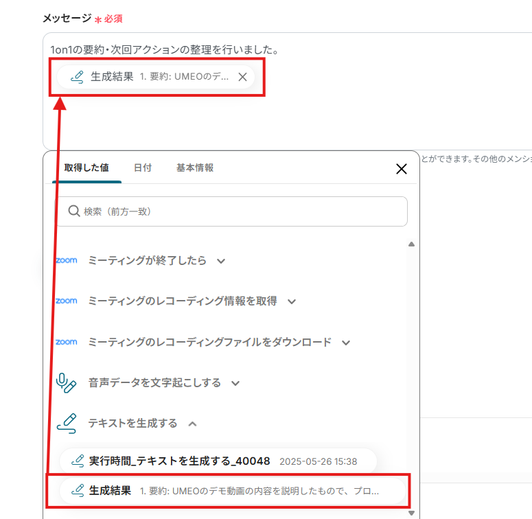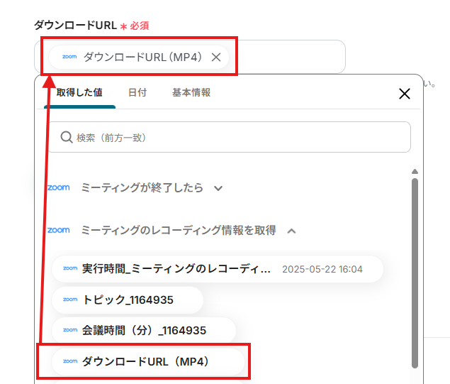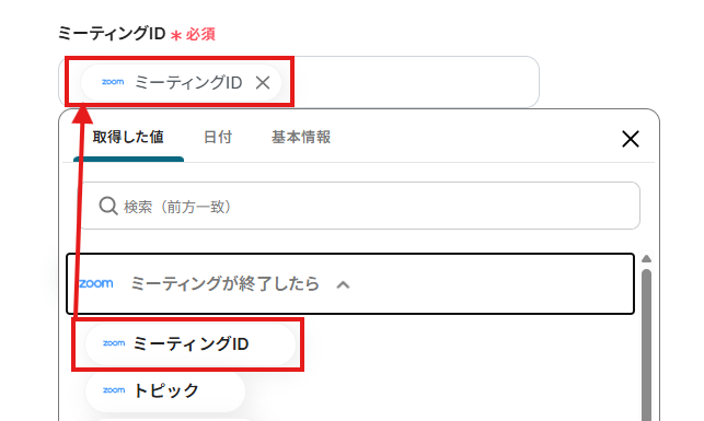 「ミーティングID」は、入力欄をクリックして表示されるアウトプット(取得した値)から選択してください。