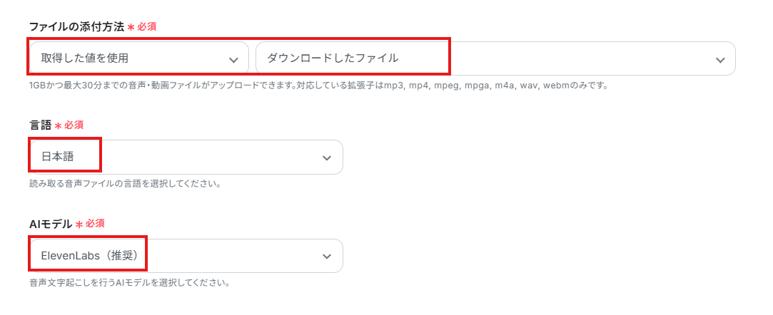 「ファイルの添付方法」「言語」「AIモデル」は、プルダウンから選択してください。