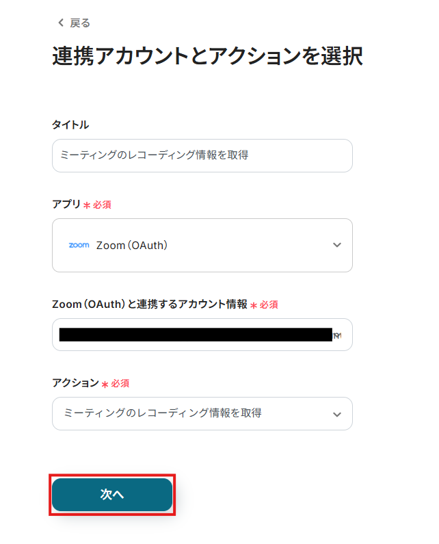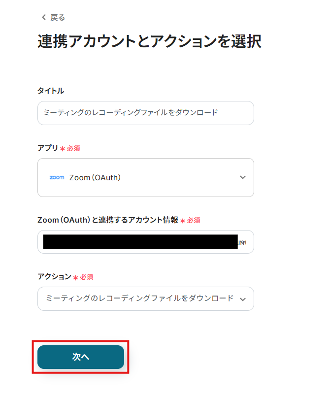 連携するアカウント情報には、ステップ1で連携したアカウント情報が反映されています。トリガーアクションはそのままにして、「次へ」をクリックしてください。