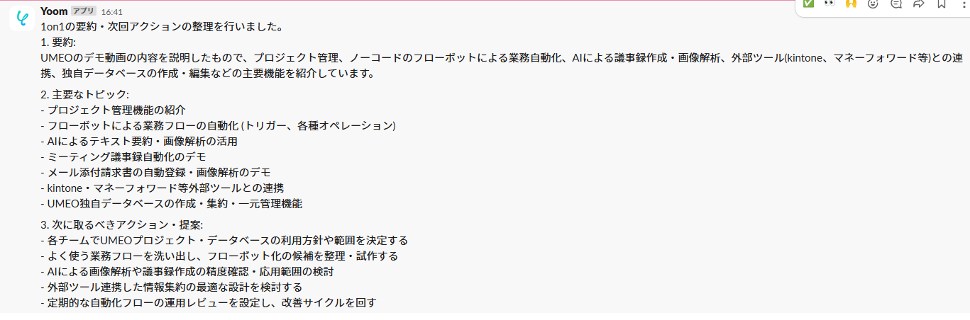 この自動化によって、議事録作成の手間を削減し、迅速な情報共有や的確なフォローアップを実現できます。気になる内容があれば、ぜひクリックしてみてください!