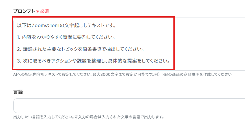 「プロンプト」は、AIへの指示内容を入力する項目です。「言語」は、出力したい言語を入力してください。