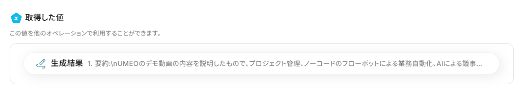 取得したアウトプットは、後続のオペレーション設定時の値としてご利用いただくことができ、フローボットを起動する度に、変動した値となります。