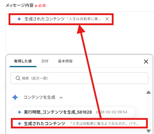 「メッセージ内容」はGeminiで生成した結果の取得した値から入力しましょう。