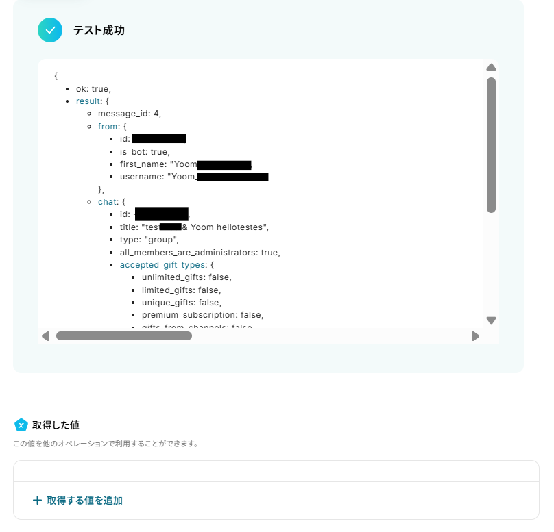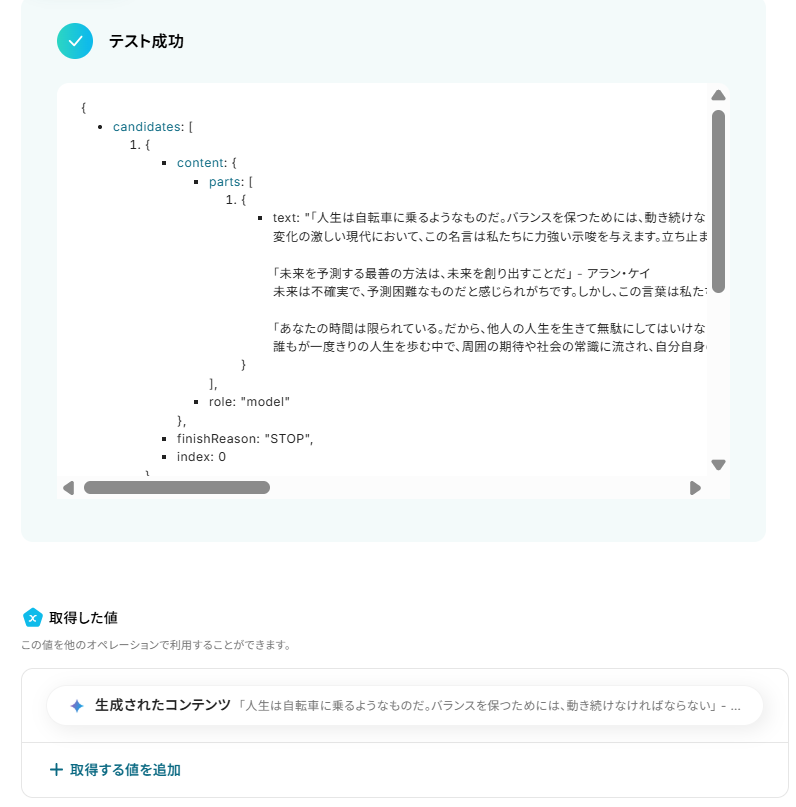 上記入力が完了したらテストボタンを押します。テストが成功し、生成された内容が取得した値に入ればOKです。