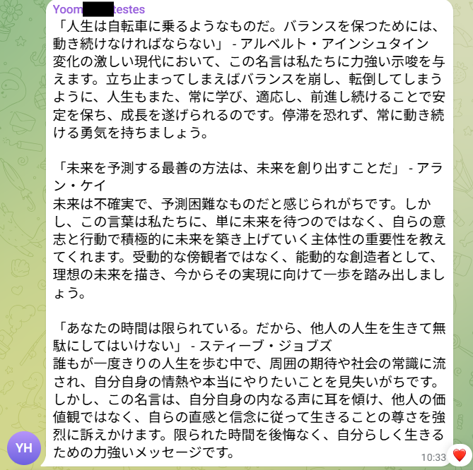 もし、AIが自動で世界中の名言を生成・翻訳し、 毎日設定した時間にTelegramなどのメッセージングアプリへ配信してくれる仕組みがあればいいなと思いますよね。