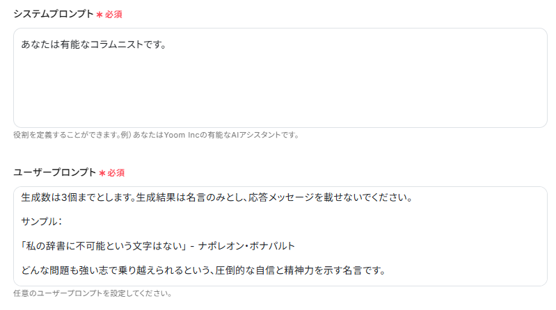 - Geminiのプロンプト設定では、「勇気が出るような歴史上の偉人の名言を一つ生成してください」など、生成したい名言のテーマや形式を任意で設定してください。