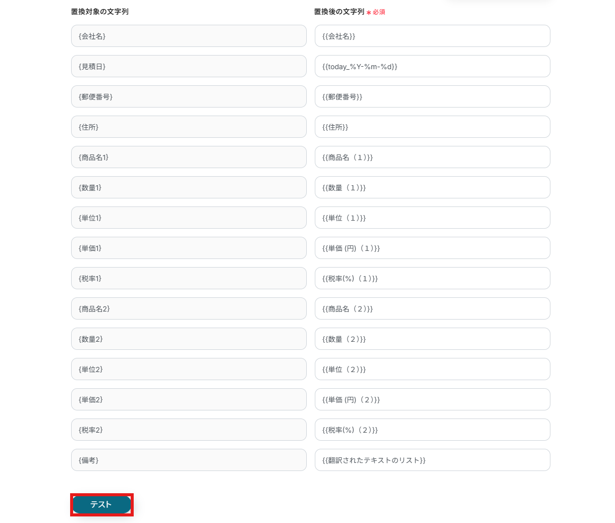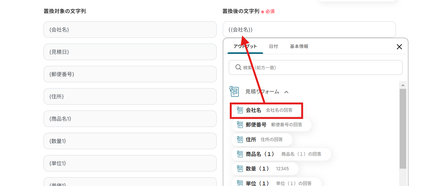 11.各項目を設定していきます。入力欄をクリックして、「見積りフォーム」の欄から置換後の文字列を設定してください。