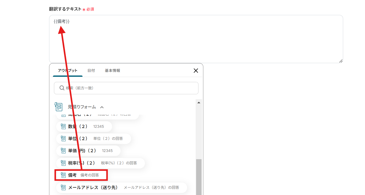12.以下の画像のように設定すると、フォームから取得した情報をそのまま見積書に引用できます。