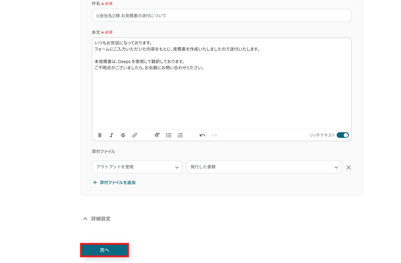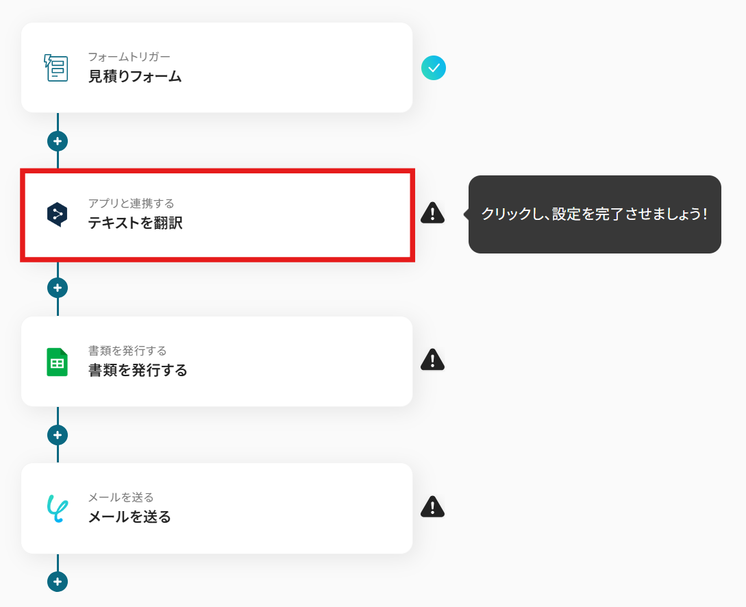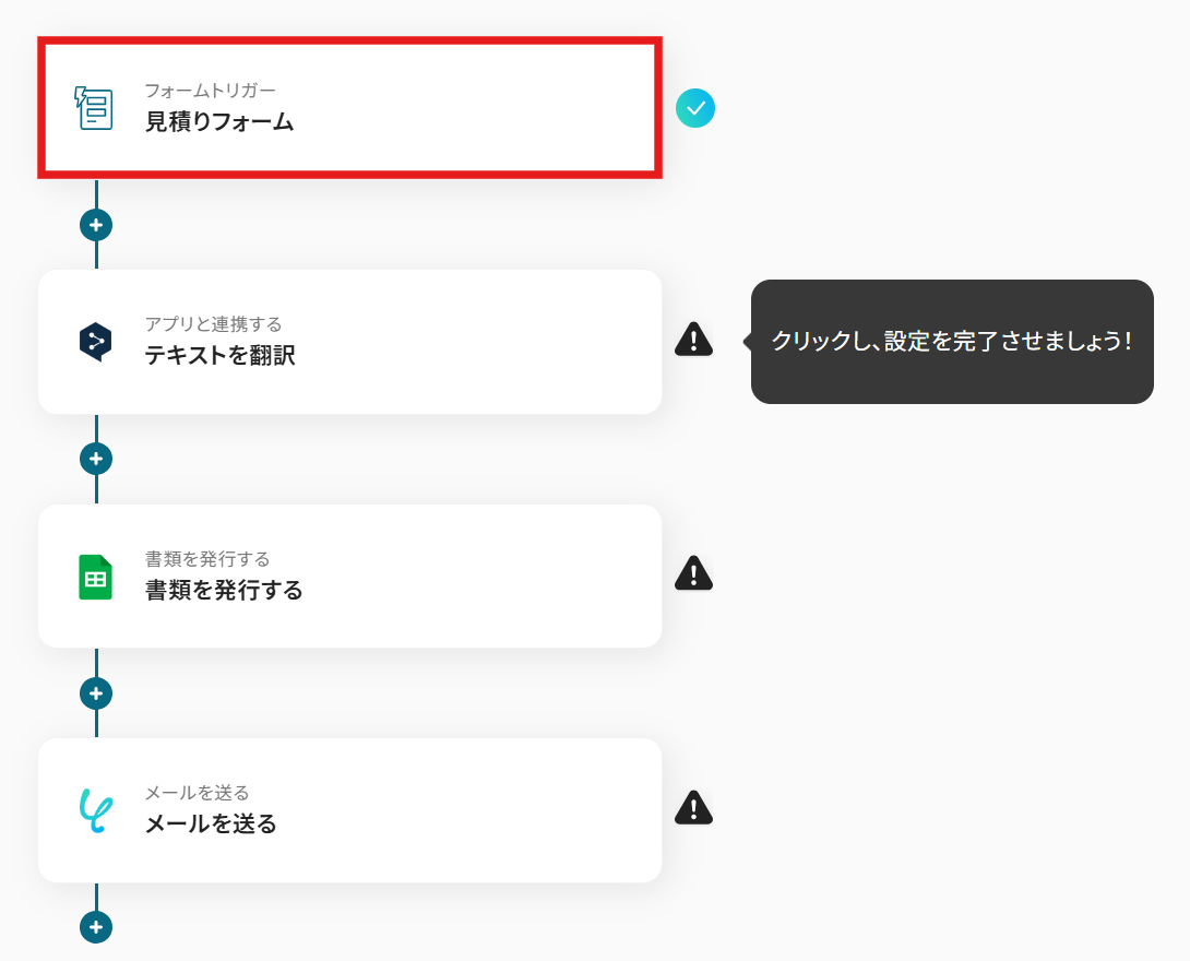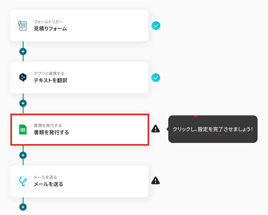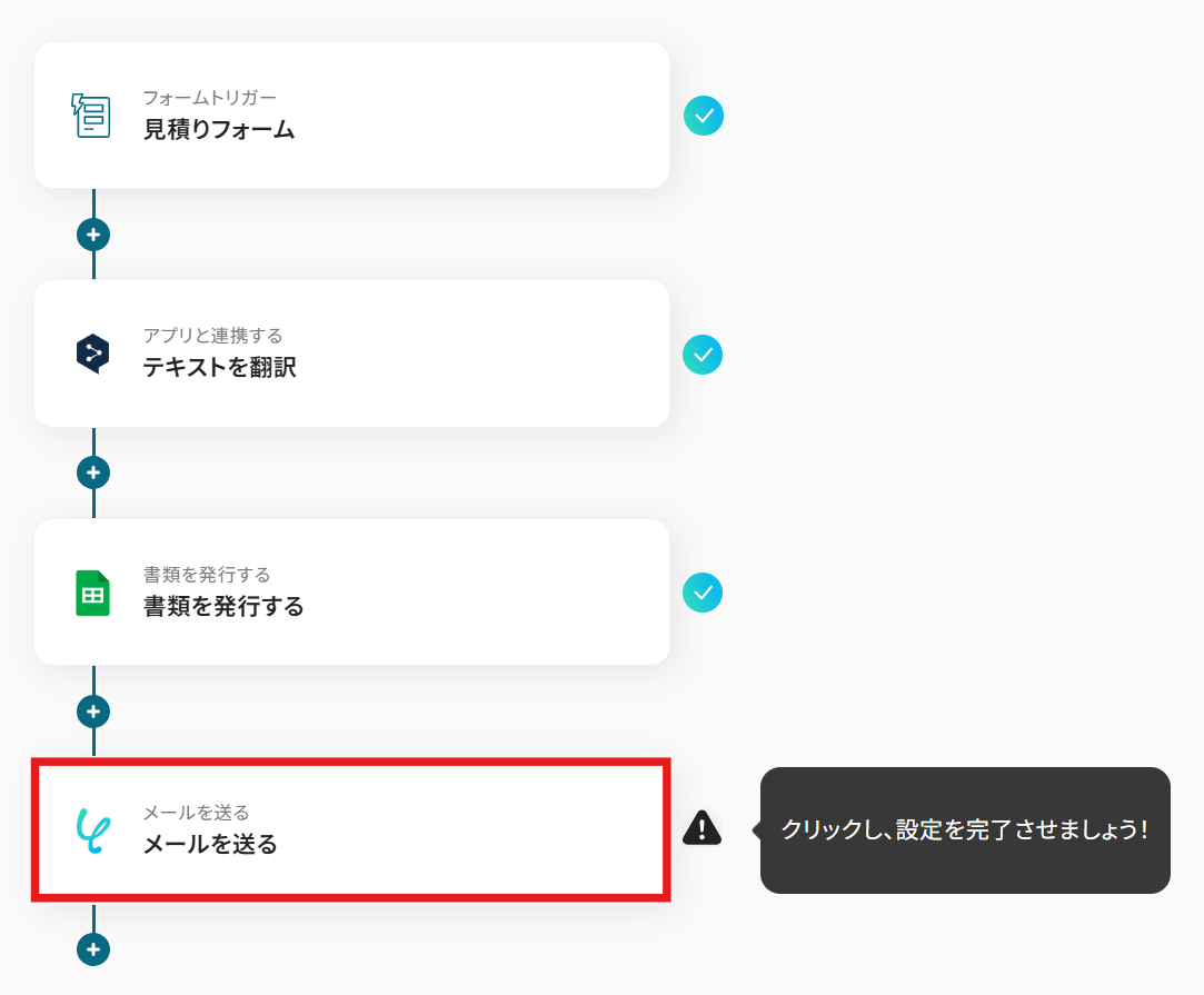 これで、【フォームで回答された見積もりをDeepLで外国語に翻訳し、見積書を発行・送付する】というフローが完成しました。