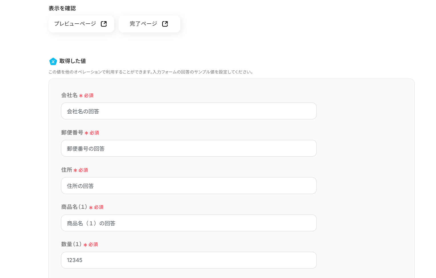 取得した値には、以下の画像のようにテストで使用する会社名などを設定しておきましょう。