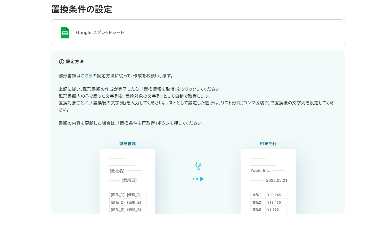 10.置換条件の設定を行います。雛形書類の設定は以下のリンク先を参照して作成してください。「書類を発行する」の設定方法