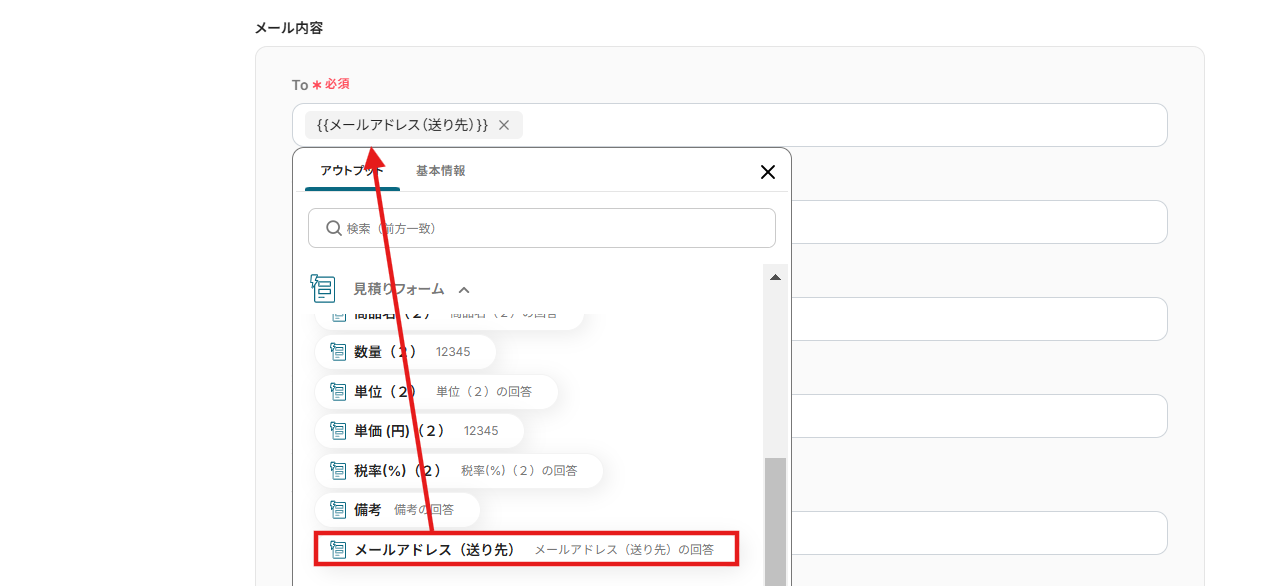 Toは入力欄をクリック → 赤枠を選択すると、見積りフォームで取得した情報が表示されるので、活用してください。