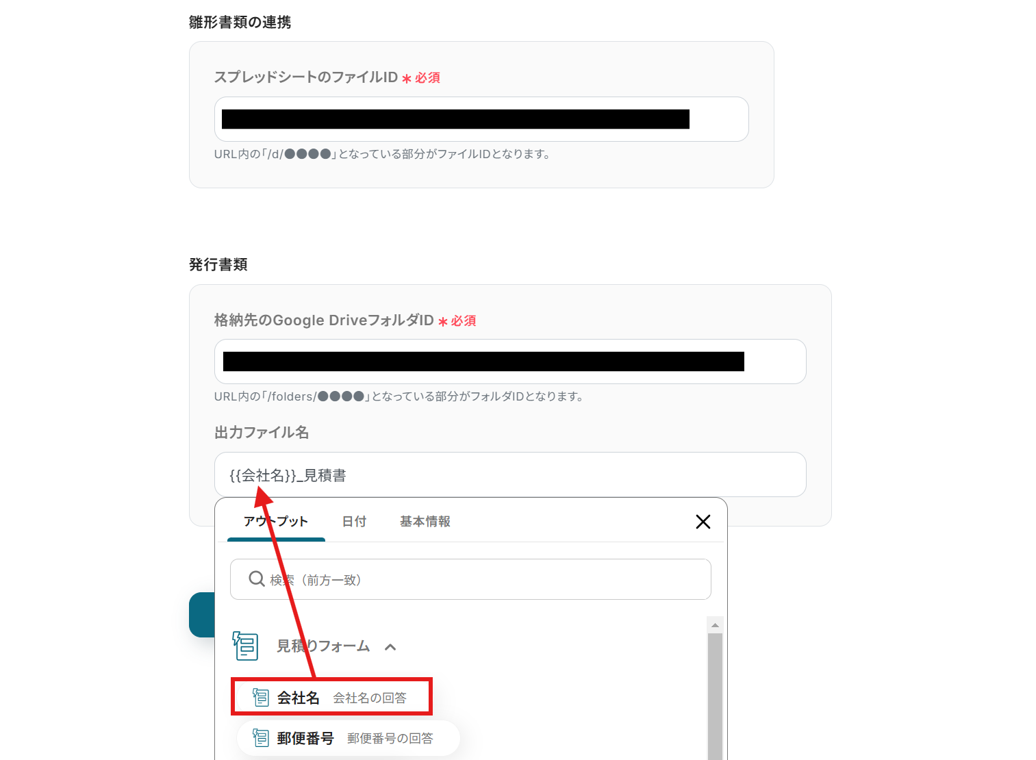 出力ファイル名は見積りフォームの情報から引用できるので、ファイル名を設定するときに活用してくださいね。