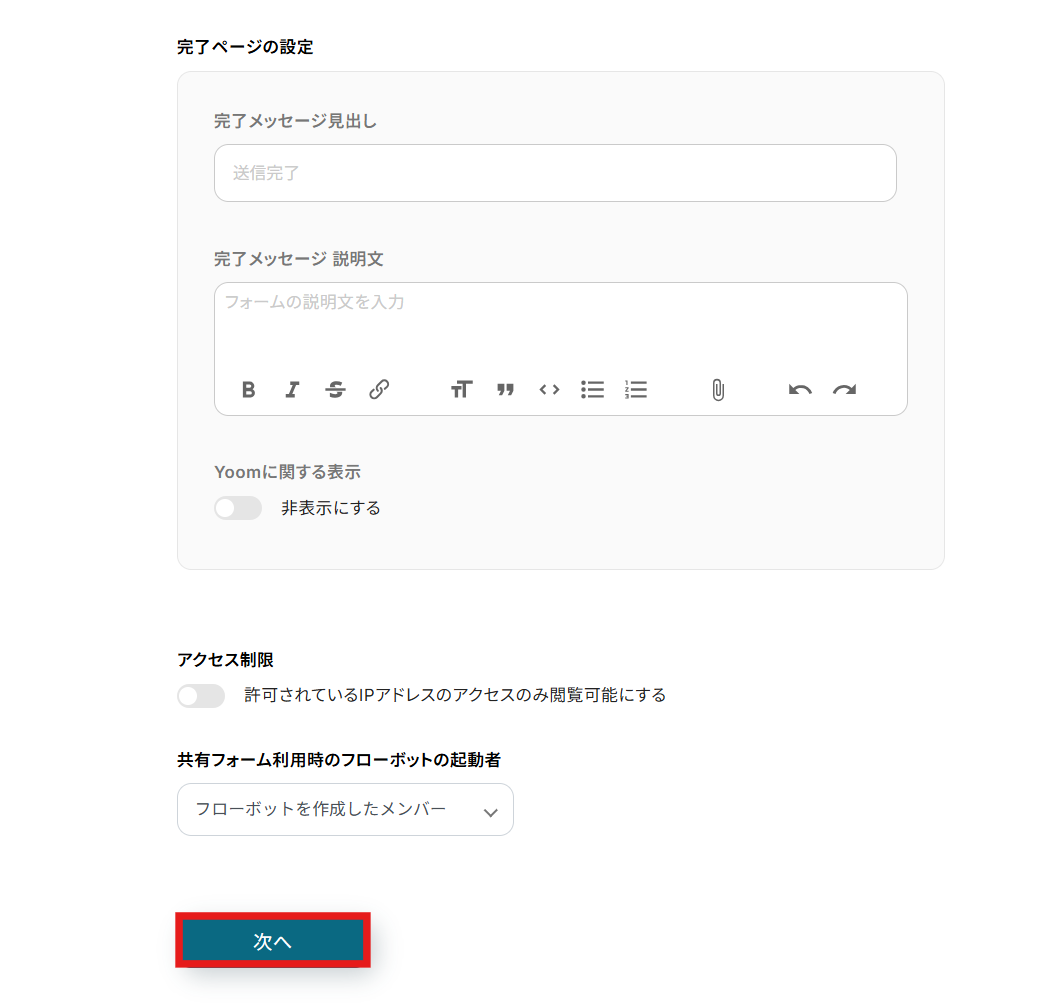 下の方にスクロールすると完了ページの設定が表示されます。