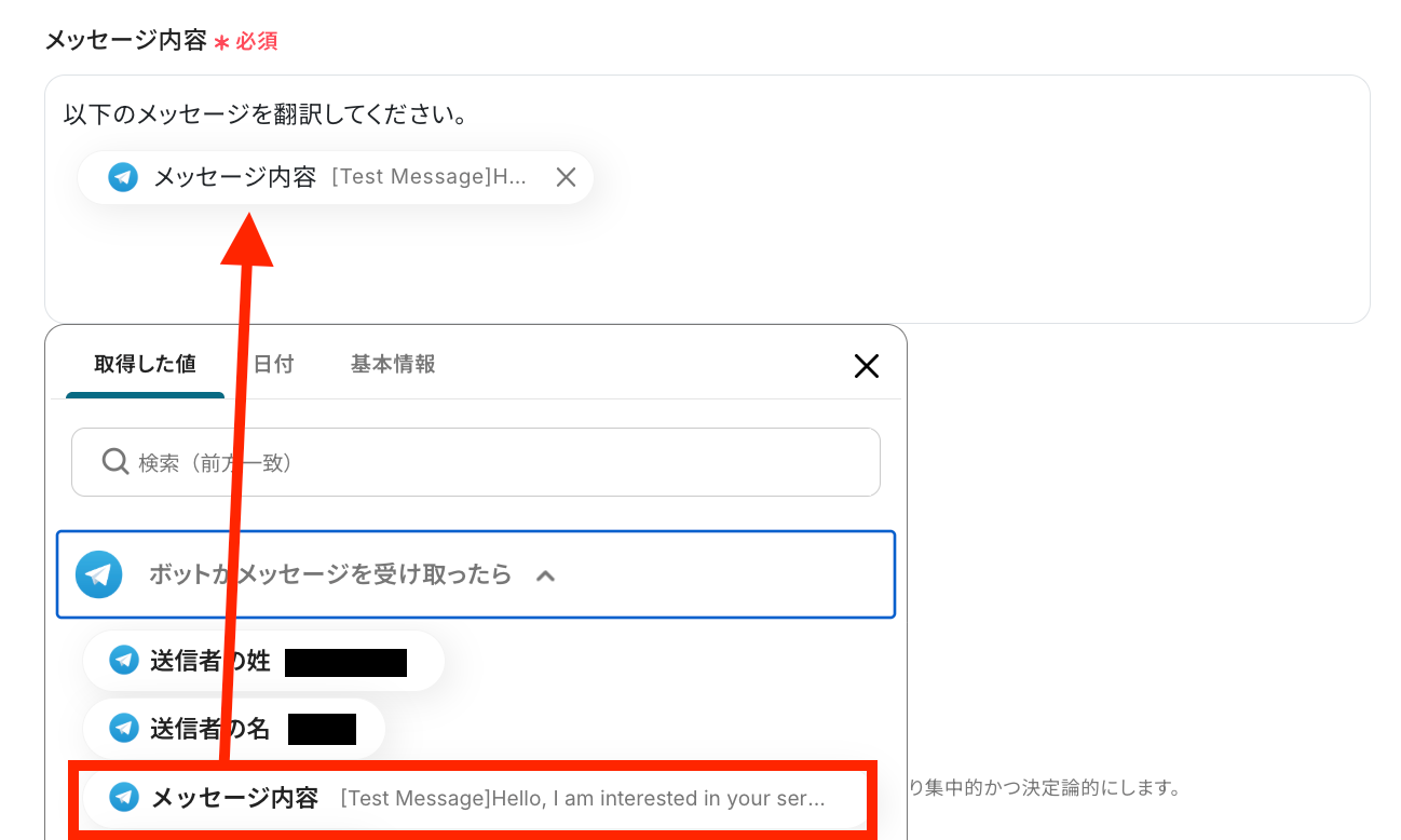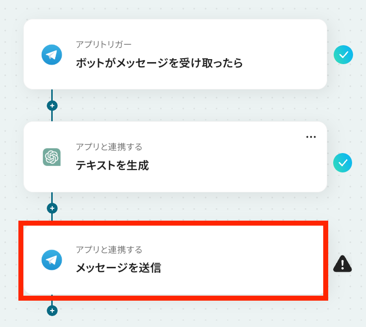 ステップ5:Telegramでメッセージを送信する設定 最後に取得した値を利用して、メッセージを送る設定を行います。