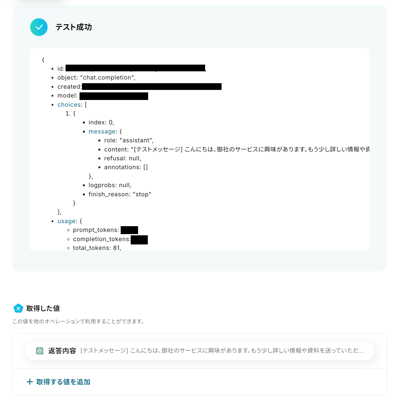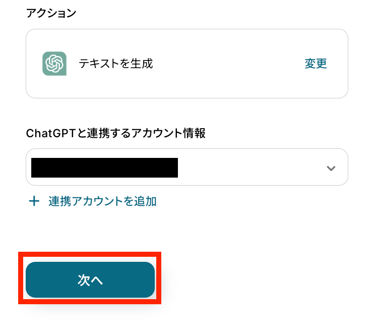 ステップ4:ChatGPTでテキストを作成する設定 次に、取得した値を利用して、ChatGPTで返信文を作成する設定を行います。
