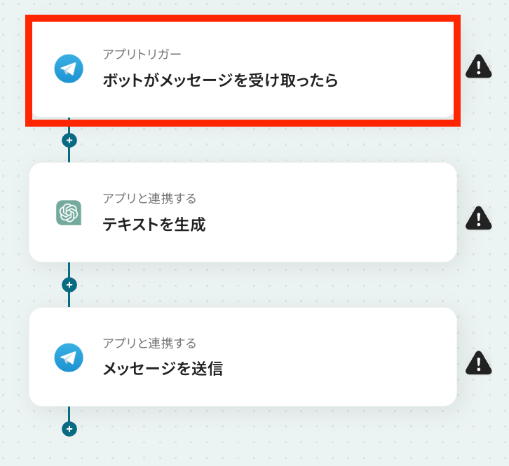 TelegramのメッセージをChatGPTで自動翻訳するフローを作ってみよう それではここから代表的な例として、Telegramのボットがメッセージを受け取ったら、ChatGPTで内容を翻訳し、結果を自動で返信するフローを解説していきます!