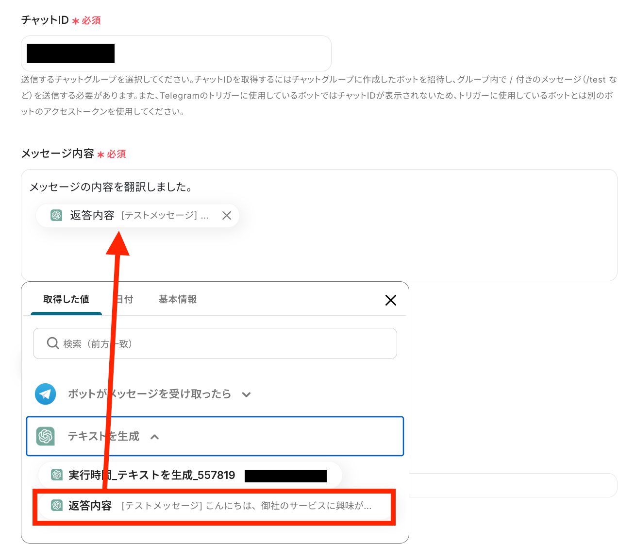 チャットIDは候補から選択し、メッセージ内容を先ほど取得した値を活用して設定します。 ※候補が表示されない場合、該当のチャットで「/」付きのメッセージを送信すると表示されます。