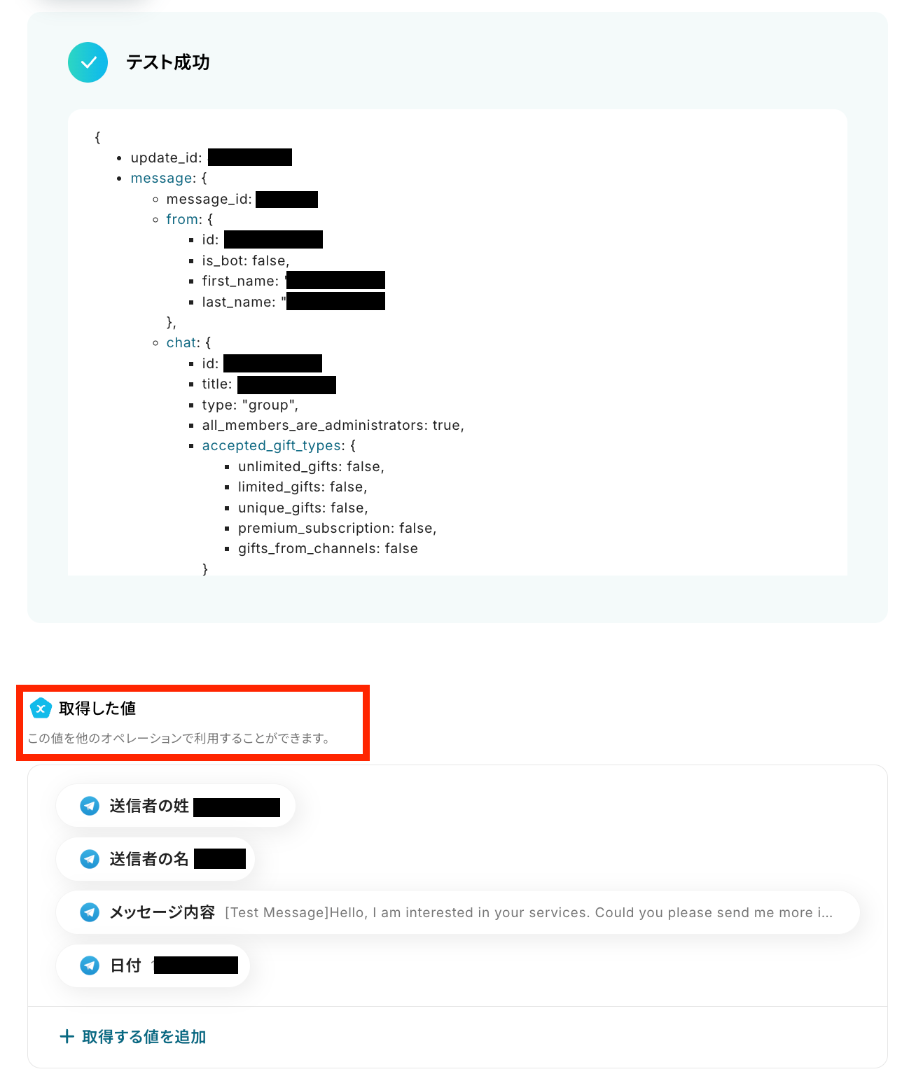 Telegramの「ボットがメッセージを受け取ったら」で取得したメッセージ本文、送信者情報、日時などの値を、後続のBox「フォルダを作成する」オペレーションで変数として埋め込むことが可能です。 ■注意事項