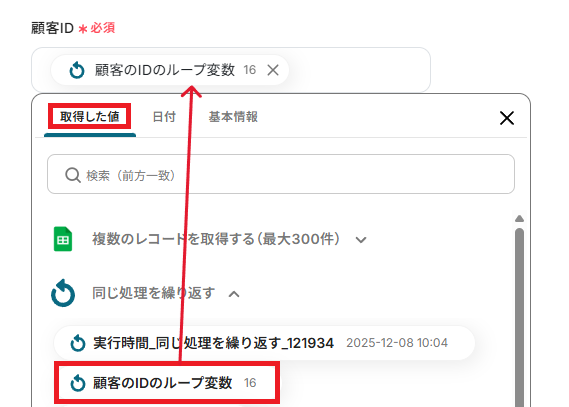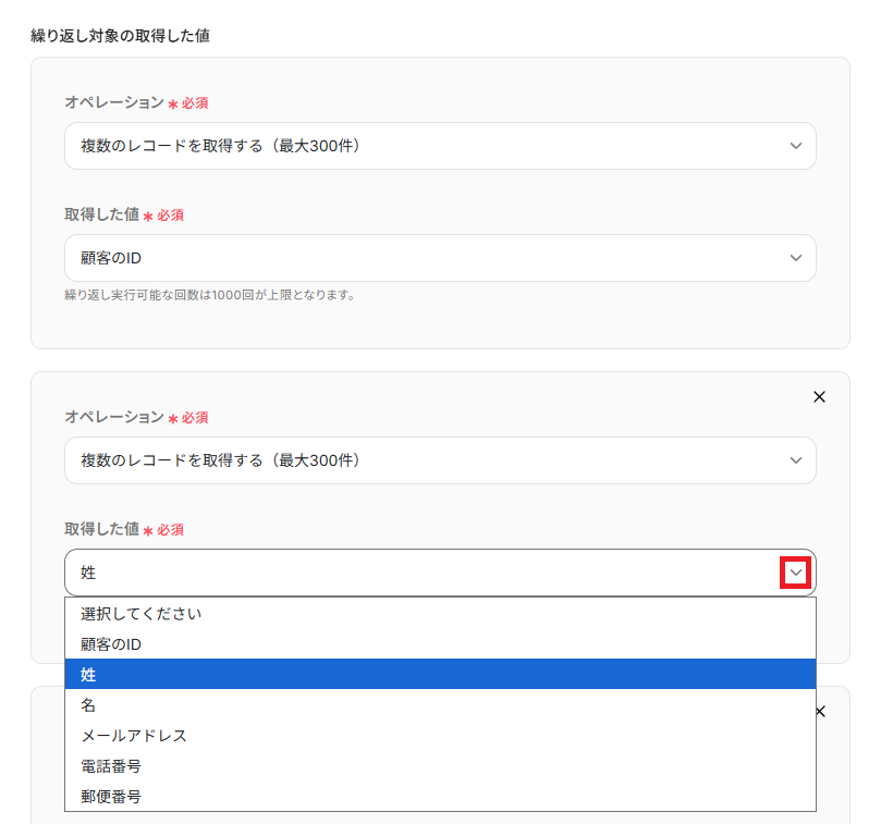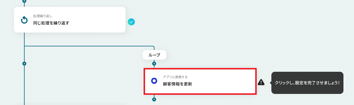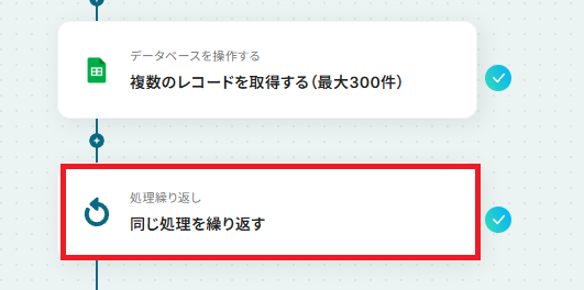 - 次に、繰り返し機能を設定し、取得した顧客情報1件ずつに対して後続の処理を実行するようにします。