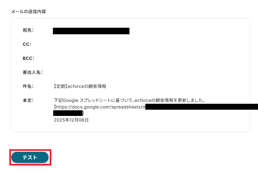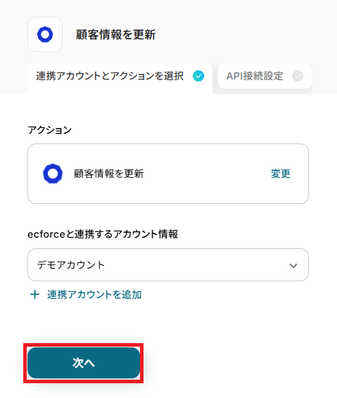 - 繰り返し処理の中で、ecforceの「顧客情報を更新」アクションを設定し、スプレッドシートの情報を紐付けます。