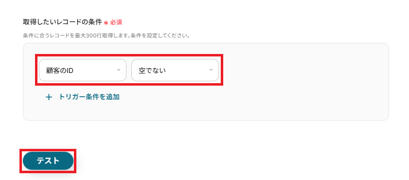 今回は顧客のIDが入力されているレコードを取得するため、以下のように設定しました。