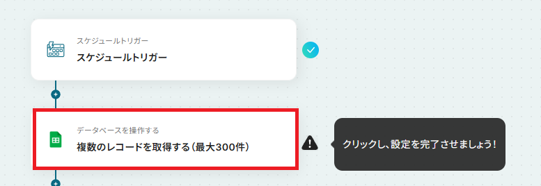 - 次に、オペレーションでGoogle スプレッドシートの「複数のレコードを取得する」アクションを設定し、更新対象の顧客情報が記載されたシートからデータを取得します。
