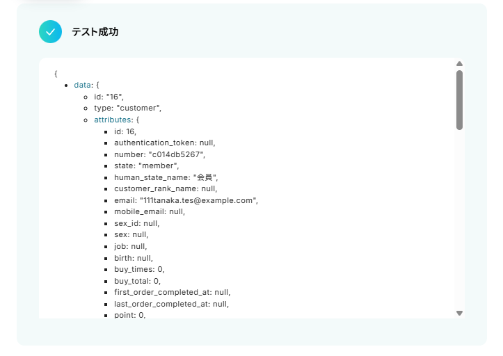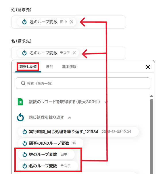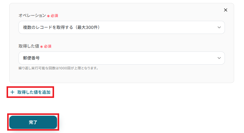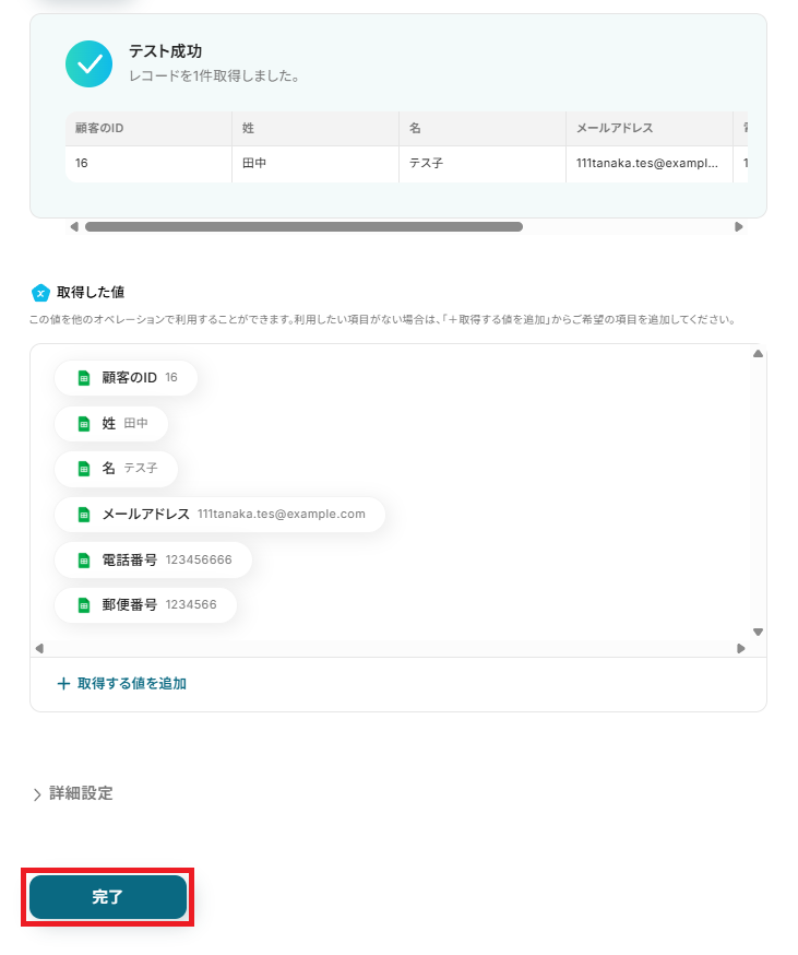 テストに成功すると、条件に合うレコードが全て(最大300件)取得され、「取得した値」に追加されます。