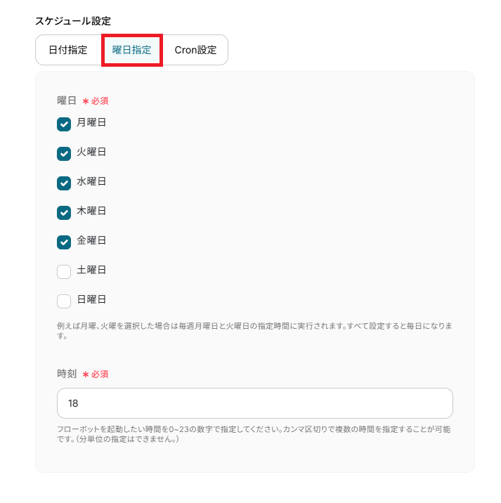 日付指定以外にも、曜日指定やCron設定を使用して自由に設定することができます。