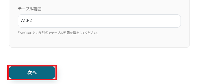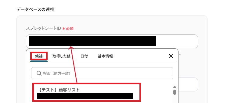 「スプレッドシートID」と「スプレッドシートのタブ名」は、入力欄をクリックして表示される候補から選択してください。