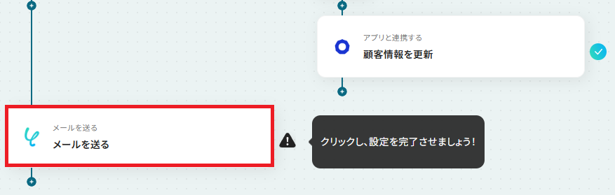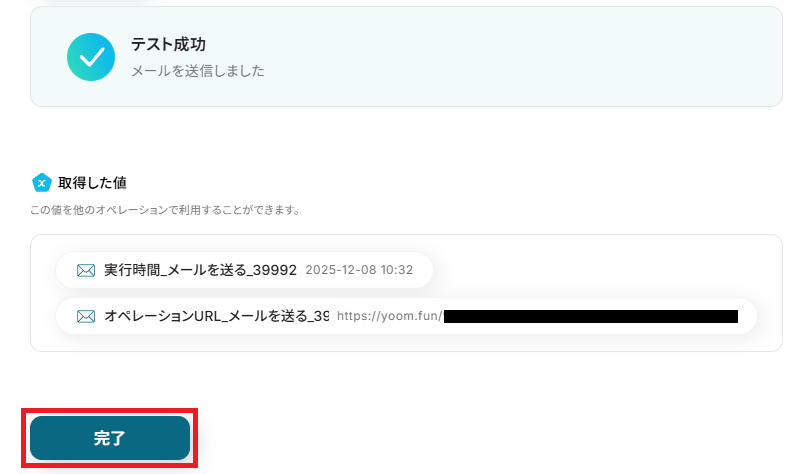 - 最後に、オペレーションで「メールを送る」アクションを設定し、処理が完了したことを担当者へ通知します。