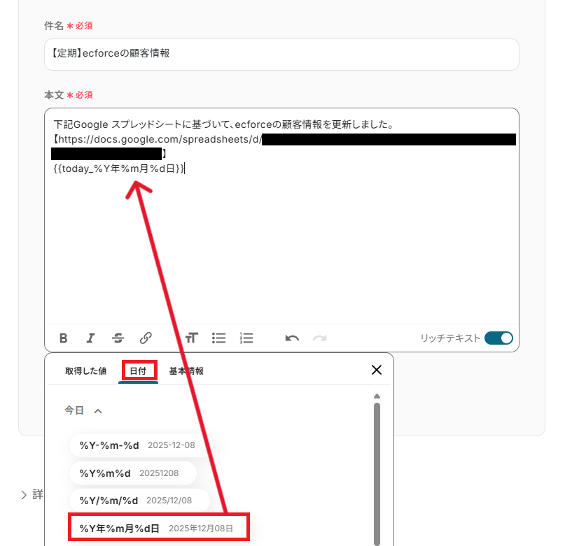 - 登録する情報に固定のテキストを追加したり、ecforceからの情報を変数として埋め込んだりするなど、柔軟な設定が可能です。