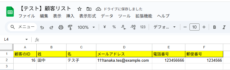 まず、テストで使用する顧客リストをGoogle スプレッドシートで作成しましょう。