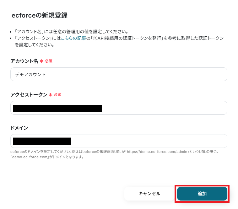 「アクセストークン」:こちらの記事の「②API接続用の認証トークンを発行」を参考に取得した認証トークンを設定する