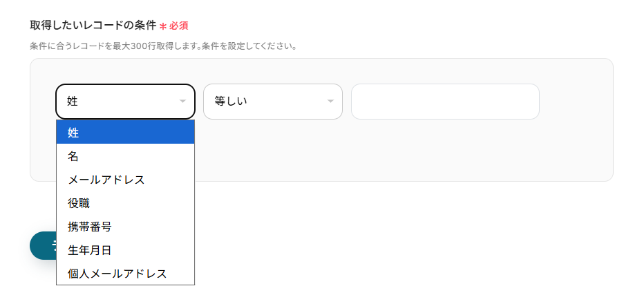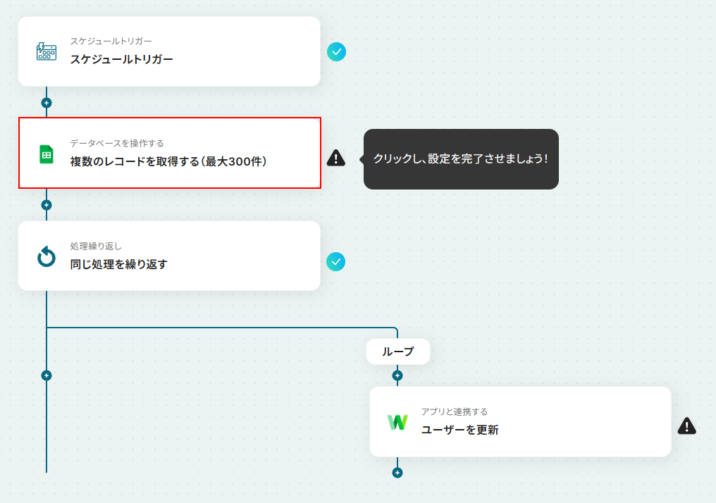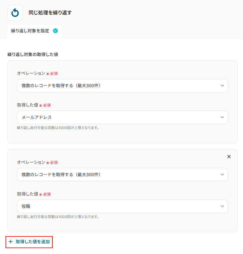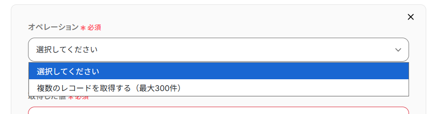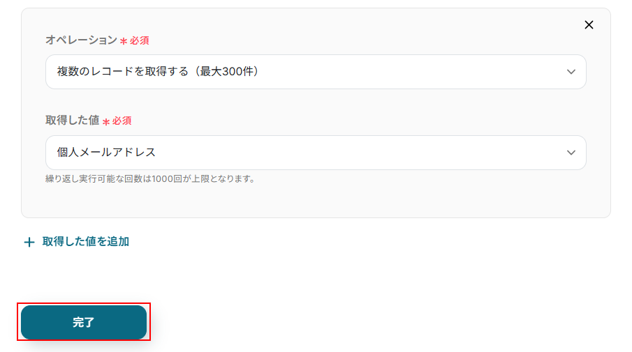 今回は先ほど設定した複数のレコードを取得する(最大300件)を選択しました。