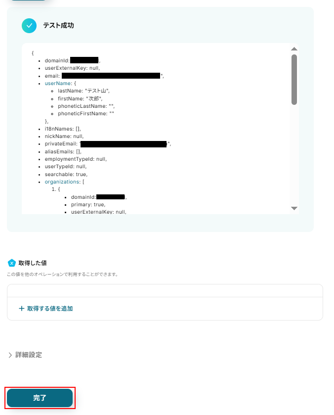 テストに成功するとテスト成功画面が表示され、取得した値が表示されます。