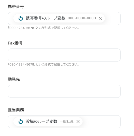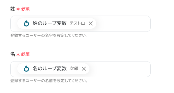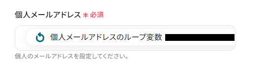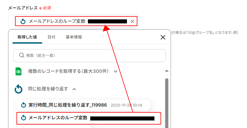 ※このアクションで取得した値を設定する際は、同じ処理を繰り返すの項目内にある〇〇のループ変数となっているものを設定してください。