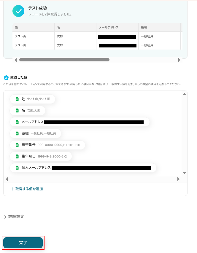 使用したい値を全て設定できたら完了をクリックしましょう。